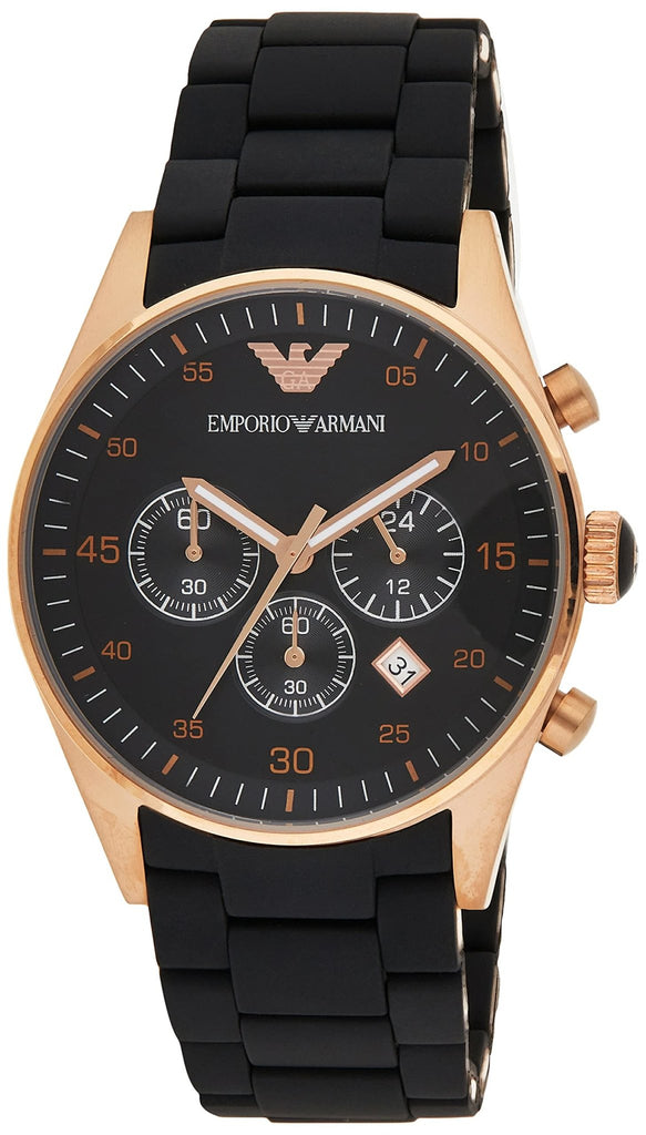A decadent gold-toned timepiece with a comfortable, sporty fit, the Men’s Black and Rose Gold Silicone Chronograph Emporio Armani Watch AR5905 is a dream to wear. This lovely watch begins with a round 38mm gold-toned stainless steel case with a fixed gold-toned bezel and a textured crown with black cabochon and two pushers. These elements surround a bold black dial, which is protected by a mineral crystal and features Arabic numeral minute markers and luminous gold-toned hands powered by precise quartz movement. The dial also features three chronograph subdials offering 60-second, 60-minute and 24-hour displays with a date display window between the 4 and 5 ‘o’clock positions. A black rubber link bracelet straps this watch to the wrist, while a gold-toned deployment clasp ensures its secure placement. Finally, this watch boasts water resistance up to 165 feet (50 meters).