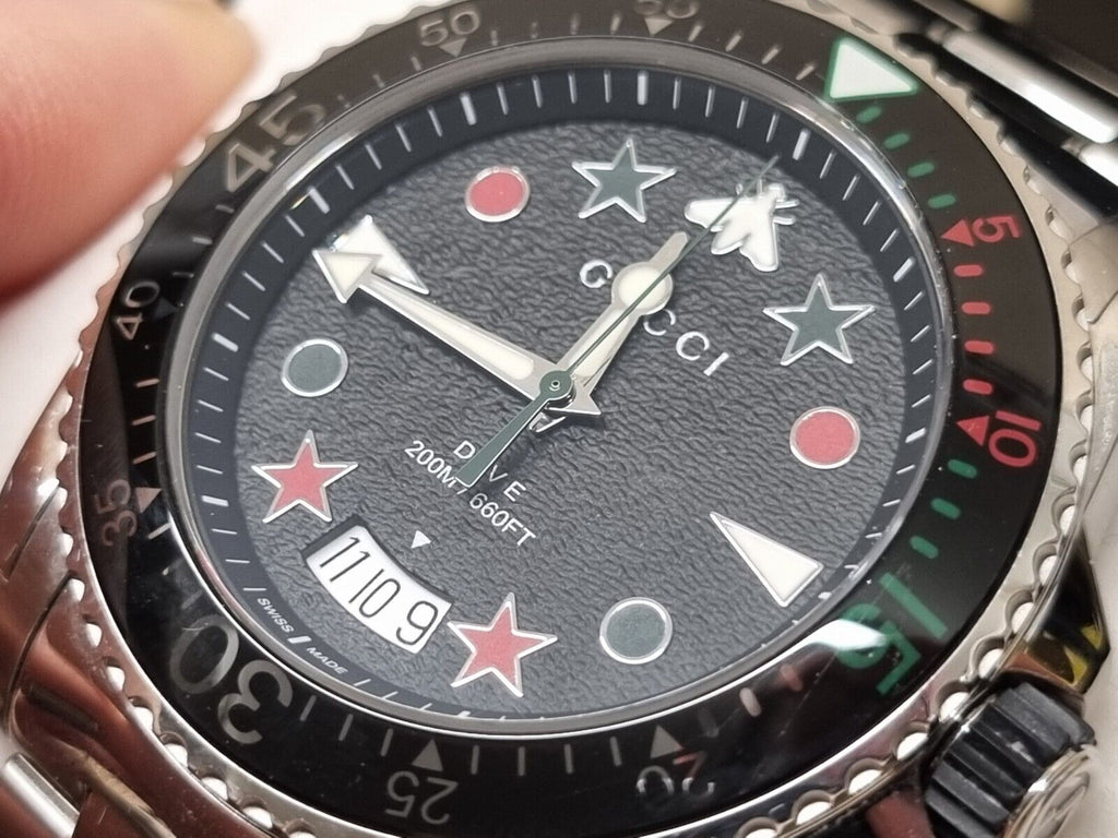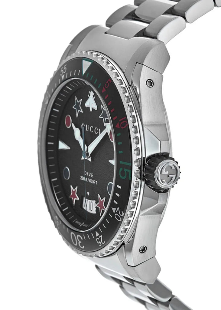 In a silhouette that mirrors the recognizable details of a diver's watch, the Gucci Dive has a contemporary appeal with a black dial and steel link bracelet. Steel case and bracelet, black bezel, black rubber crown, black dial with multi icon indexes Sapphire glass with antireflective coating