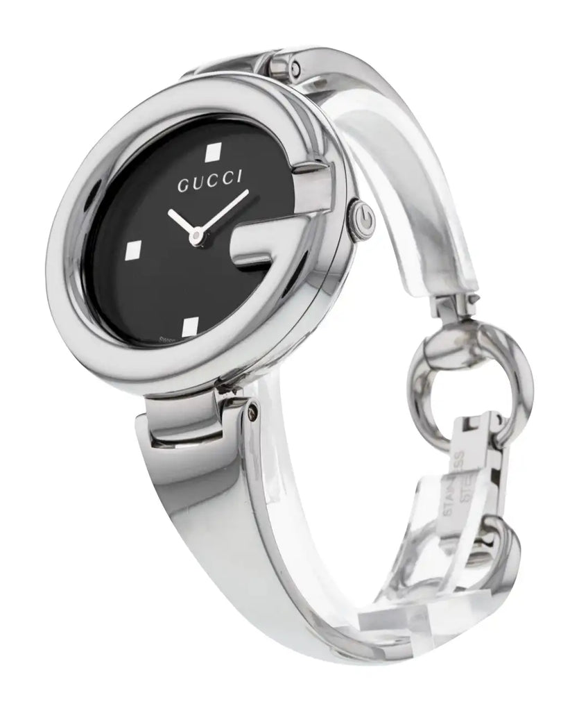 Case thickness: 9 mm. Oval case shape. Band width: 14.5 mm. Jewelry clasp. Water resistant at 50 meters / 165 feet. Functions: hour, minute. Dress watch style. Watch label: Swiss Made. Gucci Guccisima Black Dial Stainless Steel Ladies Watch YA134501.