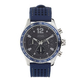 Silver-tone stainless steel case with a blue Silicone Strap Strap . Fixed silver-tone stainless steel with a blue top ring bezel. Black dial with luminous silver-tone hands and index hour markers. Arabic numeral appears at the 12 o'clock position. minute markers around the outer rim. Dial Type: Analog.