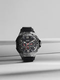 Big and bold! GUESS delivers this stunning timepiece featuring an impressive 51mm Black IP plated stainless steel case, sunray face and smooth silicone strap. Utilising quality quartz movement, practical meets functional with 3 Chronograph dials displaying, Day, Date & 24 hour timer.