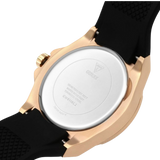 Bling it on with this stunning timepiece! Boasting baguette crystals on the gold-tone case and black multi-function dial, this silhouette features a comfortable black silicone strap.