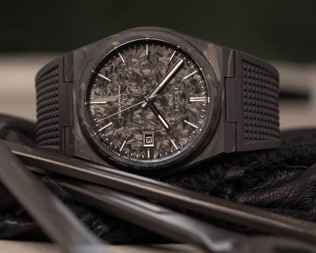 Part of the T-CLASSIC Collection, the PRX Series from the Tissot Watch Brand has sleek , smooth designs inspired by 1970's style, with modern innovations. The PRX Powermatic 80, (just as implied in its namesake) is a Swiss Automatic movement with an impressive 80-hour power reserve viewable behind an exhibition case-back. Model #T137.407.17.051.00 features a light-weight black and grey marbled forged carbon case with press textured dial making each piece unique to itself as no pattern is exactly the same.