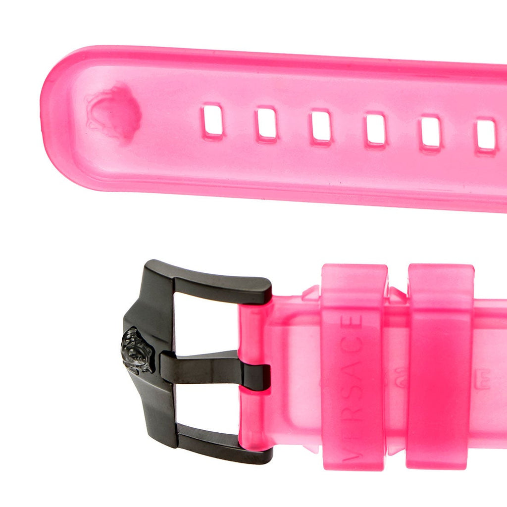 Black IP stainless steel case with a fuchsia silicone strap. Fixed black IP stainless steel bezel. Black dial with silver-tone hands and index hour markers. Minute markers around the outer rim. Medusa head marks the 12 o'clock position. Dial Type: Analog. Luminescent hands and markers.