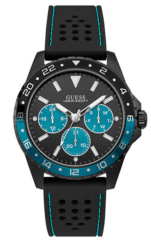 A watch that gives you the momentum to propel through your day.? A chrono-look multi-function dial with cut-thru details coordinates with a cut-thru silicone strap. Brand: Guess Product: Watch Color: Black Case Shape: Round Case Material: Stainless Steel Gender: Mens Movement: Quartz Strap / Bracelet: Silicone Watches Category: Fashion...