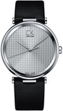 Silver dial enhanced by silver-tone hands. Silver-tone stainless steel case with a black leather band. Quartz movement. 30 meters / 100 feet water resistance. Fixed bezel. Scratch Resistant Mineral crystal. Solid caseback. Tang clasp. Pull / Push crown. Case size 40 mm x 8 mm. Band 21 mm x long. Calvin Klein K1S21120 Sight Watch.