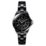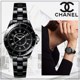 Black ceramic case with a black ceramic bracelet. Uni-directional rotating stainless steel bezel with a black ceramic ring. Black lacquered dial with luminous silver-tone hands and Arabic numeral hour markers. Minute markers around the outer rim. Dial Type: Analog. Luminescent hands and markers. Date display between the 4 and 5 o'clock positions. Quartz movement. Scratch resistant sapphire crystal. Screw down crown. Solid case back. Round case shape. Case size: 33 mm. Case thickness: 12.94 mm. Hidden fold over clasp. Water resistant at 200 meters / 660 feet. Functions: hour, minute, second. Additional Info: original box, manual (complete accessories). J12 Series. Luxury watch style. Watch label: Swiss Made. Chanel J12 Quartz Black Dial Ladies Watch H5695.