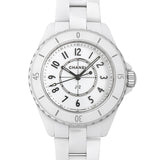 White ceramic case with a white ceramic bracelet. Uni-directional rotating stainless steel with a white ceramic ring bezel. White dial with silver-tone hands and Arabic numeral hour markers. Minute markers around the outer rim. Dial Type: Analog. Luminescent hands. Quartz movement. Scratch resistant sapphire crystal. Screw down crown. Solid case back. Round case shape. Case size: 33 mm. Case thickness: 12.94 mm. Hidden fold over clasp. Water resistant at 200 meters / 660 feet. Functions: hour, minute, second. J12 Series. Luxury watch style. Watch label: Swiss Made. Chanel J12 Quartz White Dial Ladies Watch H5698.
