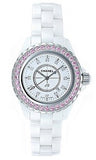 Chanel J12 white ceramic and steel pink sapphires 33 mm watch. Model reference: H2010. White high-tech ceramic and steel case. White dial set with 12 diamond indicators. Quartz movement. White high-tech ceramic bracelet, steel triple folding clasp. Swiss made. Watch comes in original packaging, with set of documents and 5 years warranty.