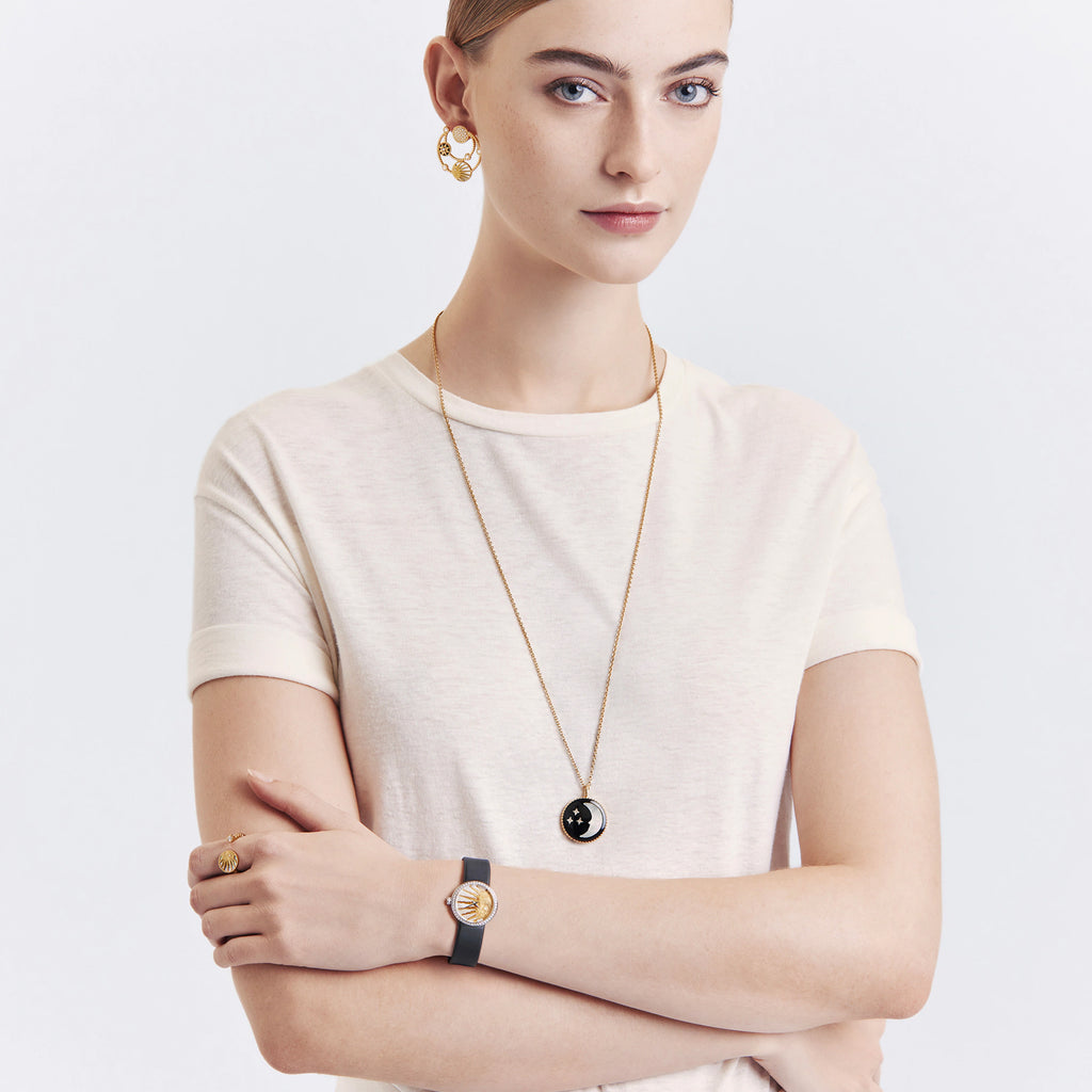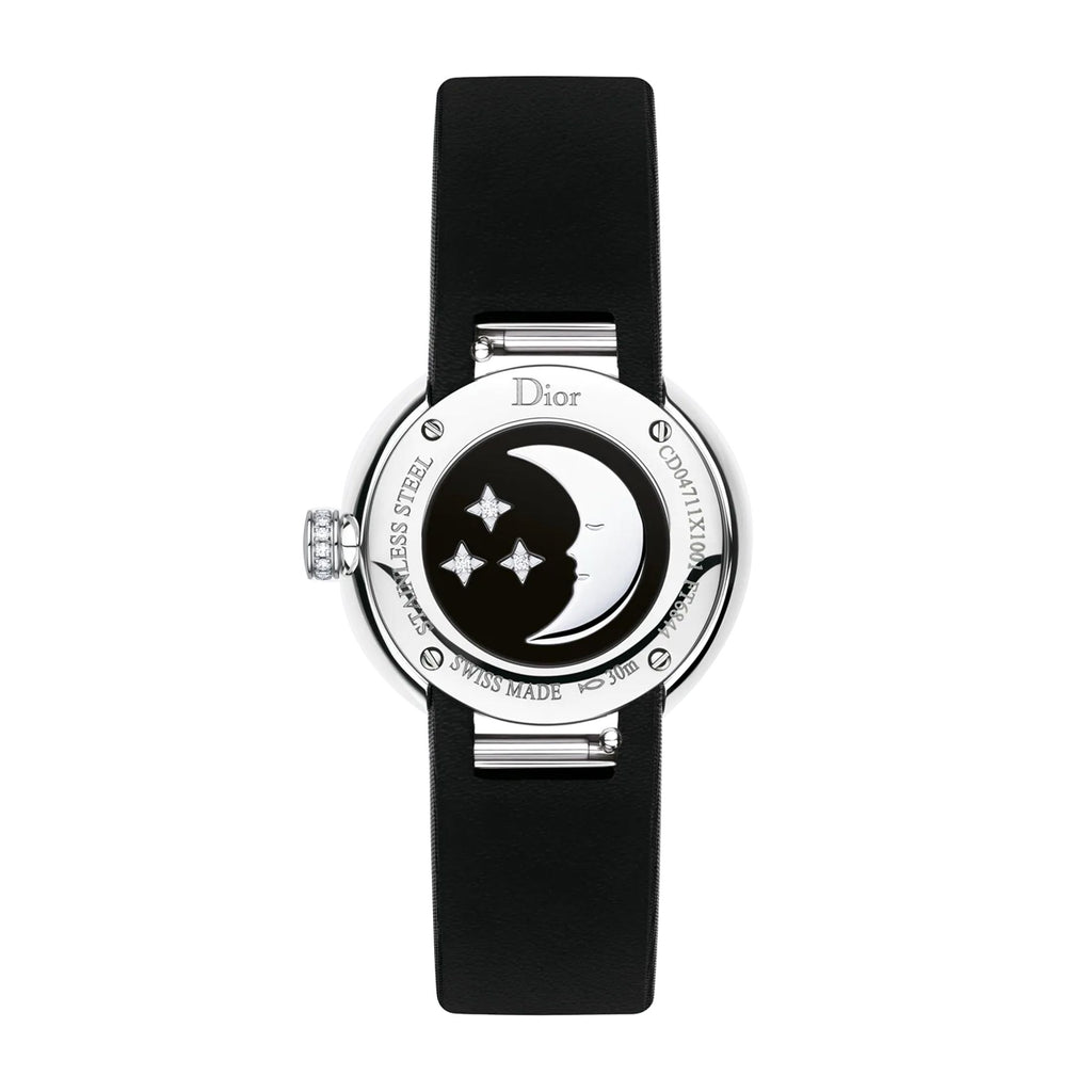 This D by Dior watch is distinguished from the other models in the line by the pattern on its pearly dial. Day from the front and night from the back, this creation signed by the famous Haute-Couture Maison is a true jewelry watch...