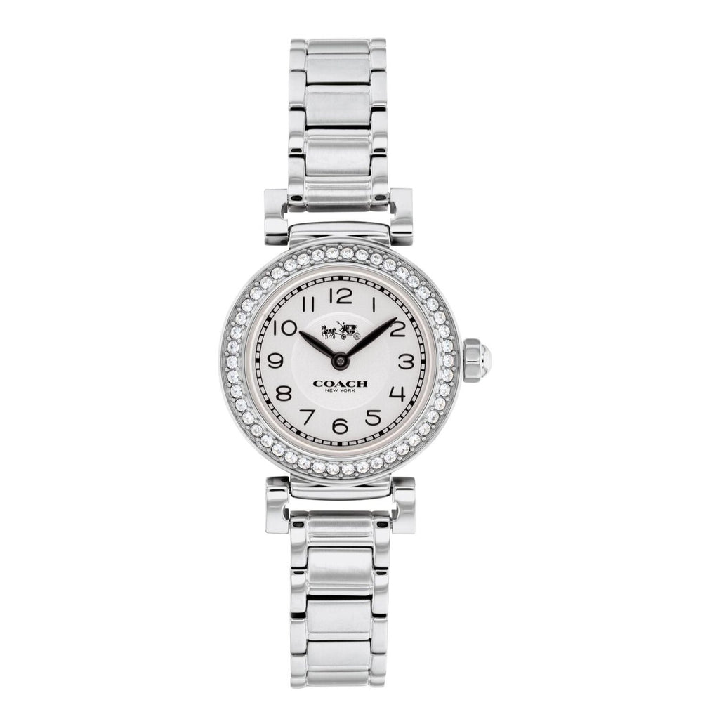 Elevate her attire with the fashionable good looks of this Madison crystal watch from Coach. Crafted in stainless steel and created exclusively for Coach by a world-renowned watchmaker, this quality timepiece features a 23.0mm case, mineral crystal, white textured dial, black hands and numeric markers, crystal-accented bezel, and iconic