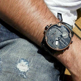 Commanding and stylish, the Diesel Mr. Daddy 2.0 watch showcases an insanely detailed chronograph black dial with copper indexes. A bold, two-tone stainless-steel IP case with copper topring and black leather strap complete the look.