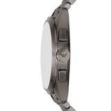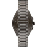 Emporio Armani's 43mm watch features a blue sunray dial with applied indexes and hands with white luminova, at least 50% recycled gunmetal stainless steel case, chronograph movement and gunmetal at least 50% recycled stainless steel bracelet.