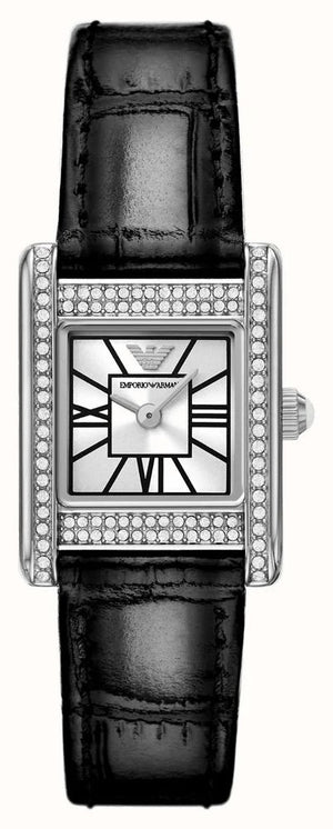 Emporio Armani Classic Crystals Silver Dial Black Leather Strap Watch for Women - AR11660