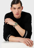 Lending a contemporary twist to an elegant design, this men's analog watch from Emporio Armani is a must-have wrist essential. The green round dial is protected by a mineral glass.