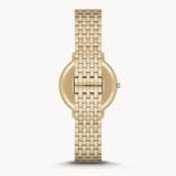 Yellow gold-tone stainless steel case and bracelet. Fixed yellow gold-tone bezel. White mother of pearl dial with gold-tone hands and crystal hour markers. Minute markers around an inner ring. The Emporio Armani Eagle appears at the 12 o'clock position. Dial Type: Analog. Quartz movement.