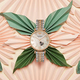 Rose gold-tone stainless steel case with a two-tone (silver-tone and rose gold-tone) stainless steel bracelet. Fixed rose gold-tone bezel set with crystals. White (open heart) dial with rose gold-tone hands and index hour markers. Roman numerals appear at the 3, 6 and 9 o'clock position. Automatic movement.
