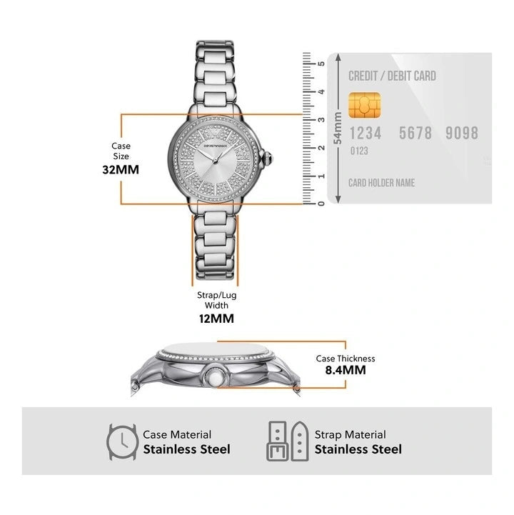 Elevate your style with the Emporio Armani Mia Watch - a statement piece that exudes sophistication! Featuring a stunning silver dial adorned with three crystals and a sleek silver steel strap, this watch is the perfect accessory for any occasion. Make a lasting impression with AR11632 on your wrist!