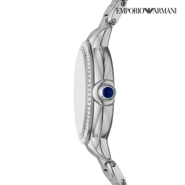 Experience elegance and sophistication with the Emporio Armani Mia Watch for Women. Featuring a sparkling blue dial adorned with shimmering crystals, this watch will certainly catch the eye. With a durable silver steel strap, it is both fashionable and functional. Elevate your style game with this stunning timepiece!
