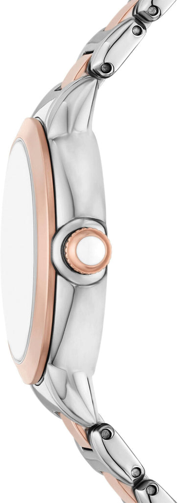 Emporio Armani's 32mm Mia watch features a silver sunray dial with crystal stones, three-hand movement and two-tone stainless steel bracelet. If you are looking for a refined look. Known for its distinctive pattern, this timepiece stands out. With a stunning design and charming looks, this is an exquisite wristwatch made for Every one.