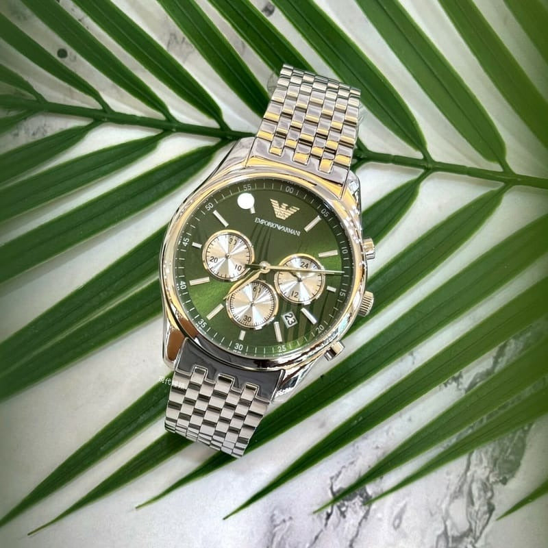 The Emporio Armani Antonio Chronograph Green Dial Men's Watch (Model AR11581) is a sleek and stylish accessory, perfect for both casual and formal wear. It features a 41mm round stainless steel case with a bold green dial, offering a striking contrast against the silver-tone accents. With a case thickness of 12mm, the watch maintains a modern and slim profile. The fixed silver-tone stainless steel bezel complements the stainless steel bracelet, which is 20mm wide and secured by a deployment clasp with a push button release for ease and security.
