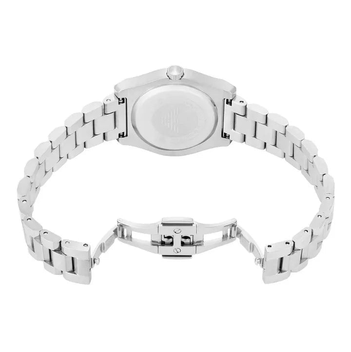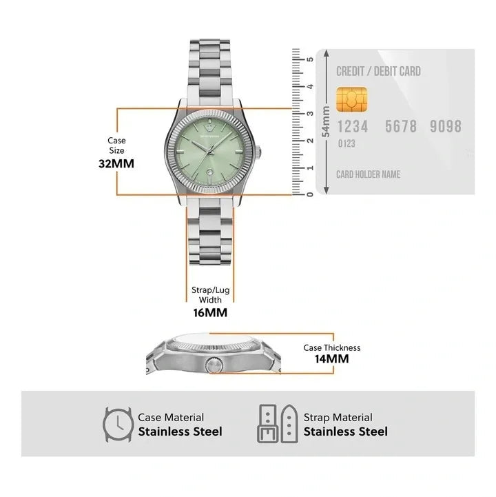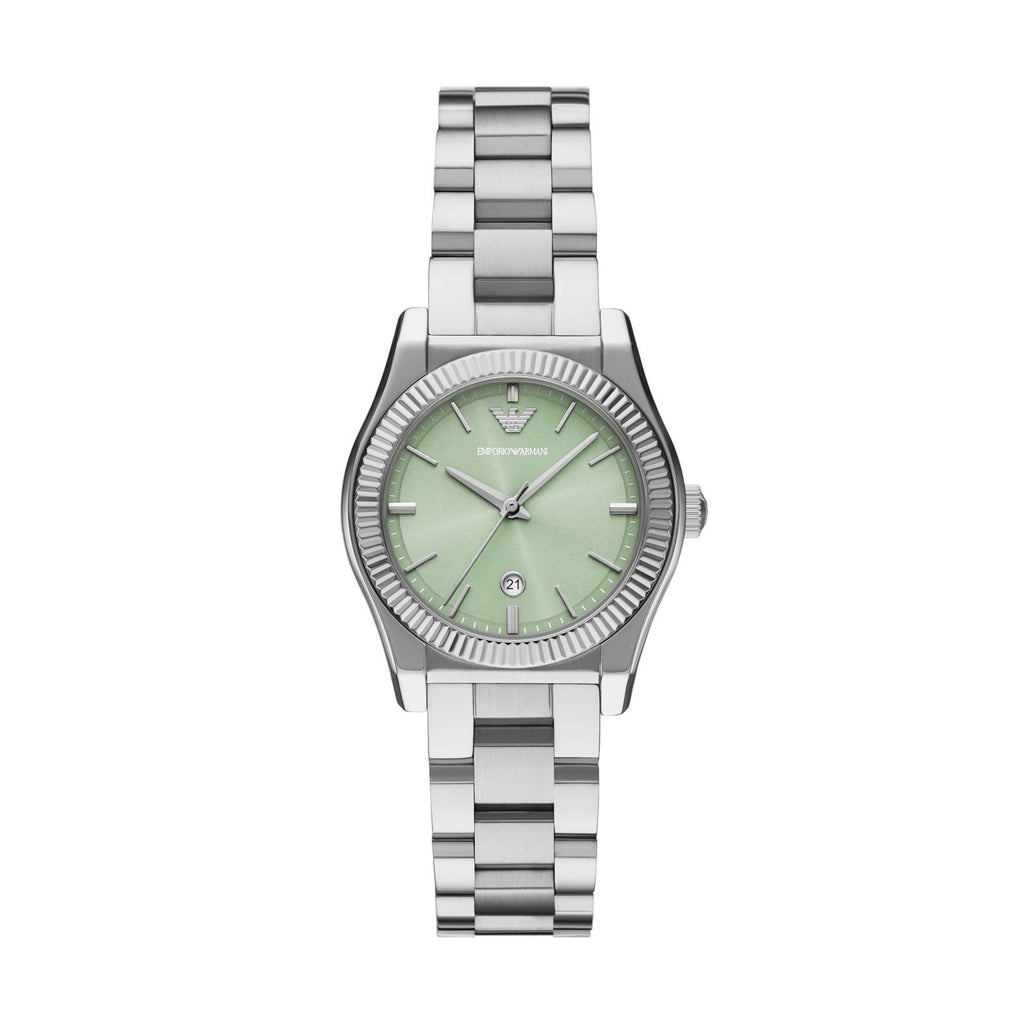 Emporio Armani's 32 mm watch features a striking mint green sunray dial, three-hand date movement, and a stainless steel bracelet. The fluted stainless steel bezel adds an element of visual intrigue, making the perfect complement to the structured watch case and bracelet