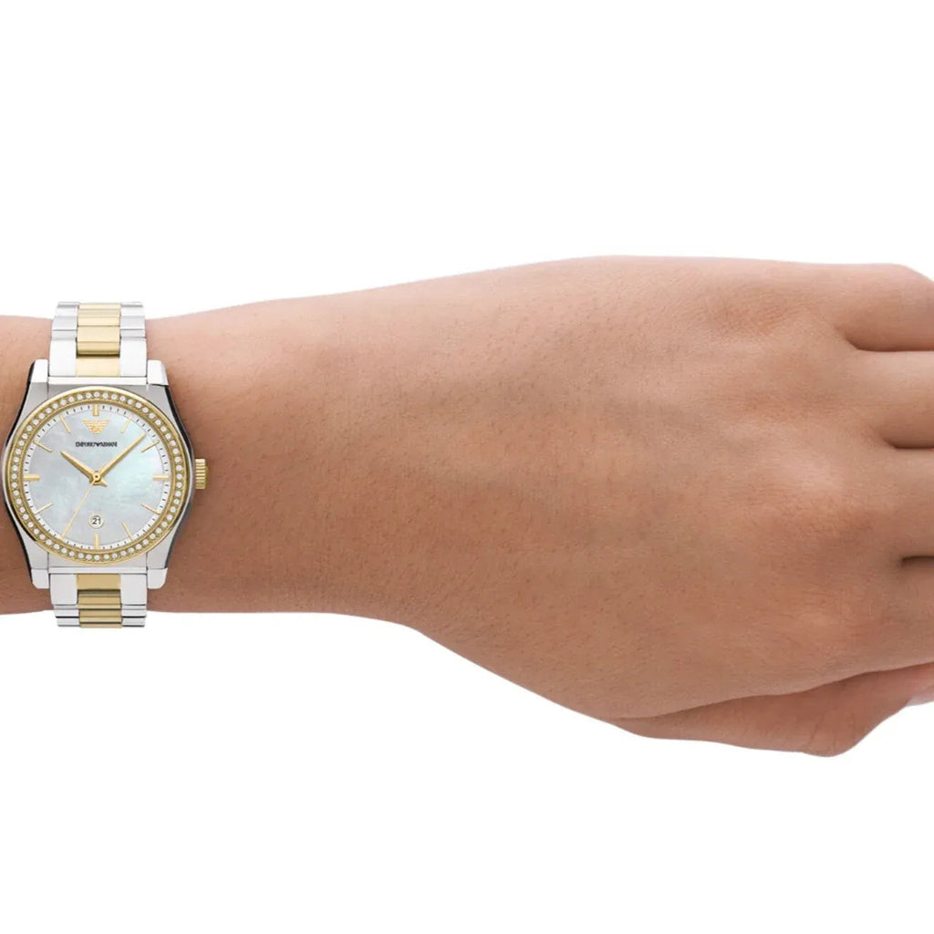 Armani Watch women's watch. Watch with 3-sphere quartz movement, made of stainless steel with round-shaped case with a mixed silver-colored finish. The dial is mother of pearl in colour. Case diameter: 32mm. Case thickness: 8mm. Lug distance: 16 mm. There are crystals on the bezel. The band is made of stainless steel, with a mixed finish. Strap colour: silver and gold. Band type: bracelet. Clasp: deployant. The water resistance is 5 atm. The reference is: AR11559.