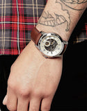 This Fossil Grant Automatic Cream Dial Men's Watch ME3052 comes in stainless steel case with a brown leather strap. Fixed stainless steel bezel. Cream skeleton-center dial with luminous silver-tone hands and Roman numeral hour markers. Minute markers around the outer rim. Dial Type: Analog.