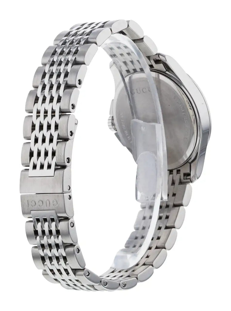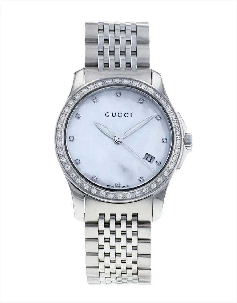 Stainless steel case with a stainless steel link bracelet. Fixed stainless steel bezel set with 42 diamonds (0.252ct.). White mother of pearl dial with luminous hands and index hour markers. Date display at the 4 o'clock position. Quartz movement. Scratch resistant sapphire crystal. Solid case back. Case diameter: 27 mm. Case thickness: 7 mm. Hidden deployment clasp. Water resistant at 30 meters (100 feet). Gucci G Timeless Diamond Bracelet Watch YA126506.