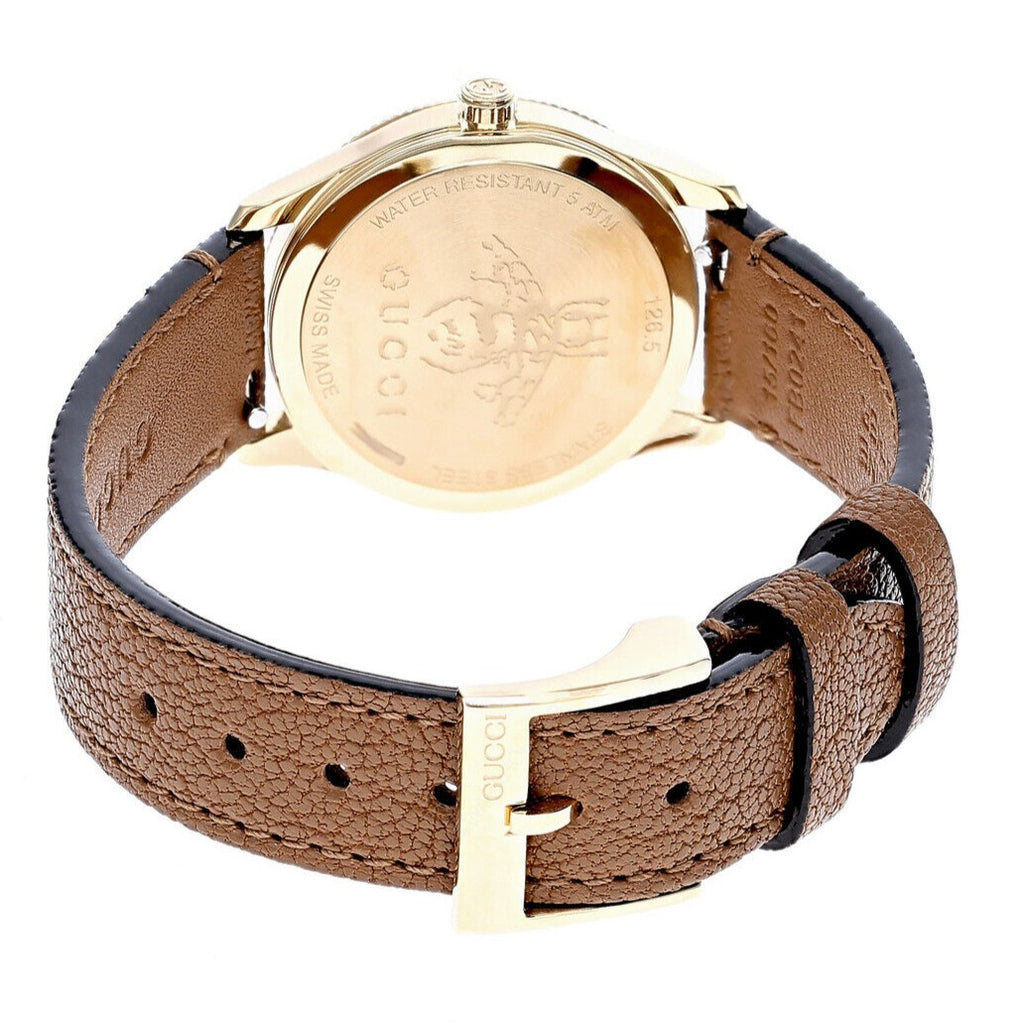 Champagne (Bee Motif) dial enhanced by gold-tone hands. Gold PVD stainless steel case with a taupe leather band. Quartz movement. 50 meters / 165 feet water resistance. Fixed bezel. Scratch Resistant Sapphire crystal. Solid caseback. Tang clasp. Pull / Push crown. Case size 32 mm. Band 15 mm x long. Gucci YA1265022 G-Timeless Watch.