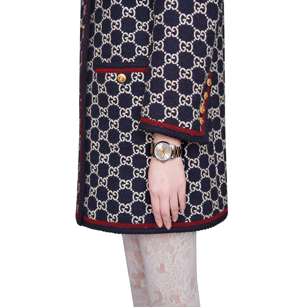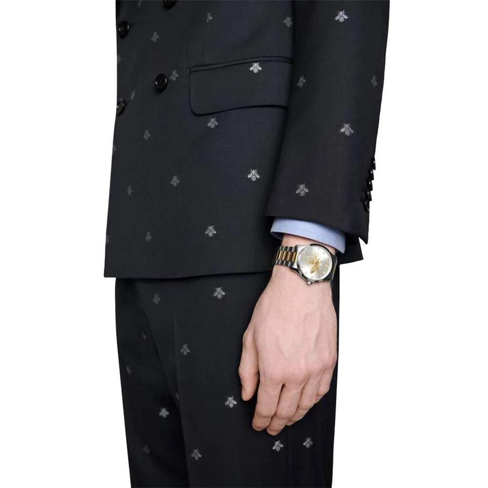 Silver Sunray (Bee Motif) dial. Silver-tone stainless steel case with a two-tone (silver-tone and yellow gold pvd) stainless steel band. Quartz movement. 50 meters / 165 feet water resistance. Fixed bezel. Deployment with Push Button Release clasp. Case size 38 mm x 8.3 mm. Gucci YA1264131 G-Timeless Watch.