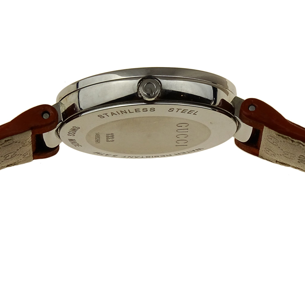 Stainless steel case with a brown leather strap. Fixed stainless steel interlocking G bezel. Brown dial with silver-tone hands. No markers. Dial Type: Analog. Quartz movement. Scratch resistant sapphire crystal.