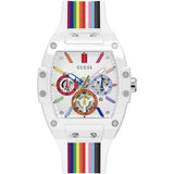 Guess men's watch Phoenix GW0720G1, with analogue quartz movement, multifunction. The case is made of white polycarbonate with screw details on the bezel that give it a robust touch. White silicone strap with multicoloured flag with buckle closure, white dial.