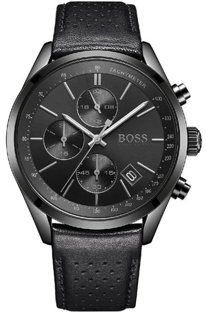Japanese Made Quartz Chronograph Movement. 24 Hour Counter. Running Seconds. 30 Minute Counter. Date. 44mm Stainless Steel Black Ion Plated Case. Scratch Resistant Mineral Crystal. Black Motif Dial. Luminous Steel Hands. Stainless Steel Stick Markers. Date Window at 4:30. Boss Logo...