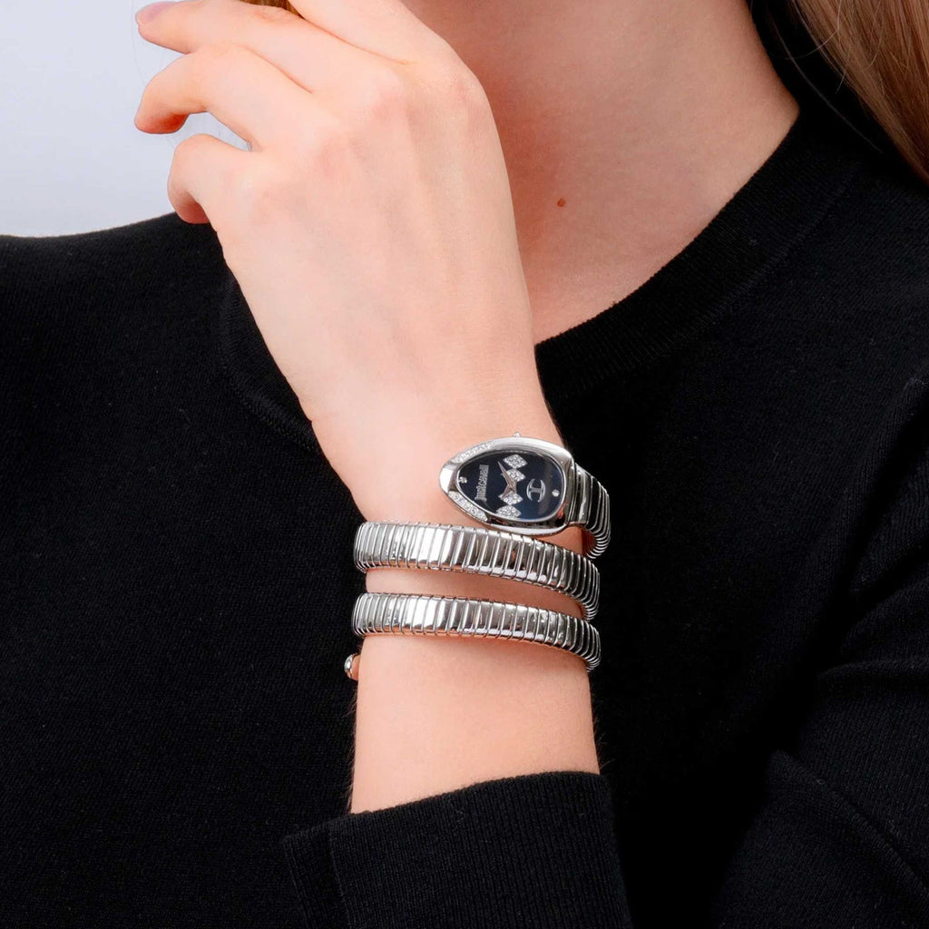 - A luxurious and elegant design in silver with a blue enamel, and it comes in the shape of a snake.