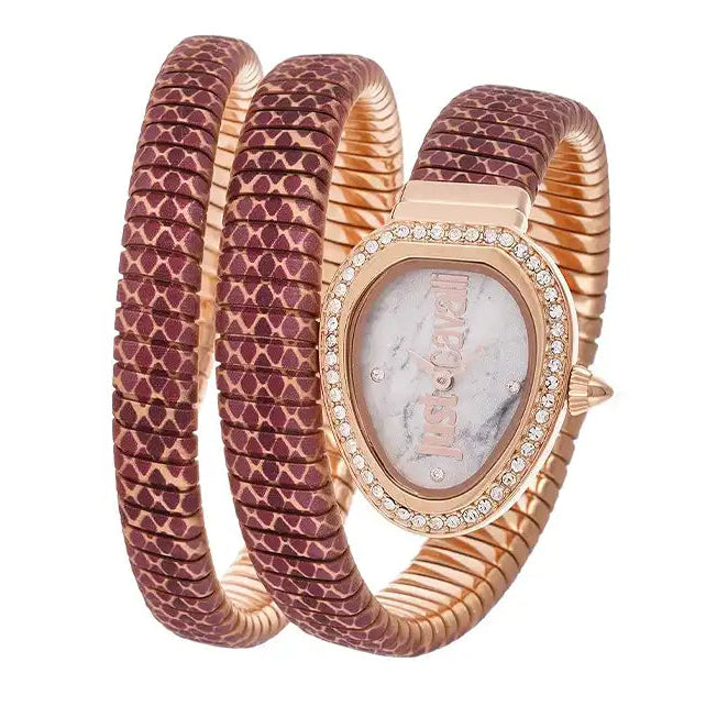 - Silver dial with crystals, 2-hands movement, and Just Cavalli branding logo at 6 o’clock position