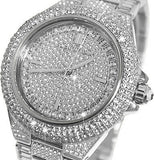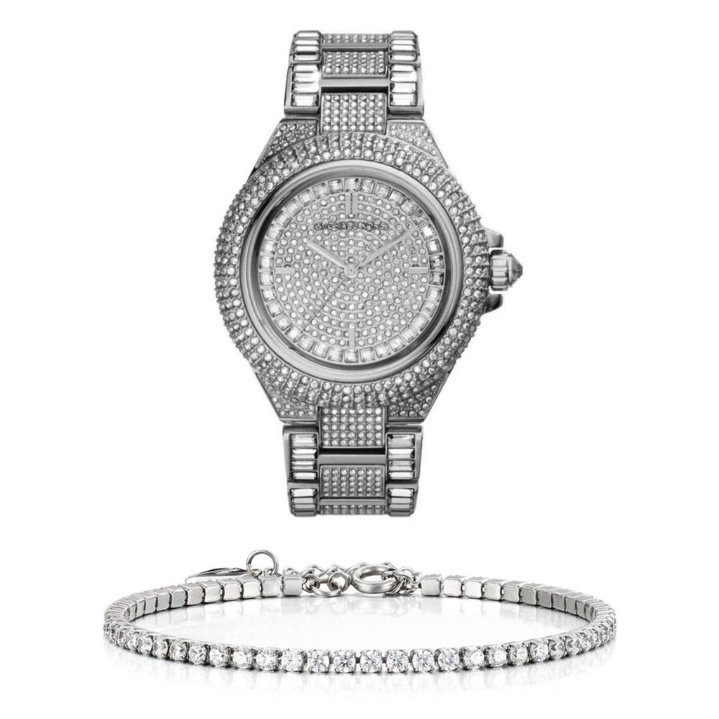 Stainless steel case with a crystal encrusted stainless steel bracelet. Fixed crystal encrusted stainless steel bezel. Crystal pave dial with silver-tone hands. Index markers at the 3, 6, 9 and 12 o'clock positions. Dial Type: Analog. Quartz movement. Scratch resistant mineral crystal. Solid case back.