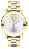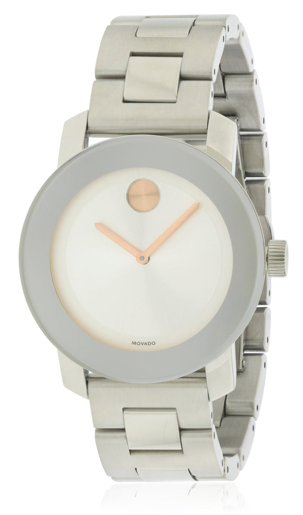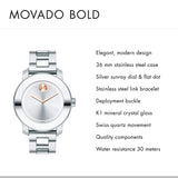 Brand New Authentic Movado Bold Stainless Steel 36mm Women's Watch Model 3600084. Stainless Steel case with Brushed and Polished Stainless Steel watch band. Fixed bezel. Dial description: Silver With Rose Gold Tone Hands and Dot dial. Silver dial. Quartz movement. Case size: 36mm. Solid case back. 30 Meters - 100 Feet water resistant