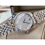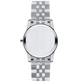 Women’s Museum Classic watch, 28 mm stainless steel case, round white mother-of-pearl dial with 11 diamond markers (0.043 t.c.w.) and silver-toned concave signature dot and dauphine hands, stainless steel link bracelet with deployment clasp, sapphire crystal, Swiss quartz movement.