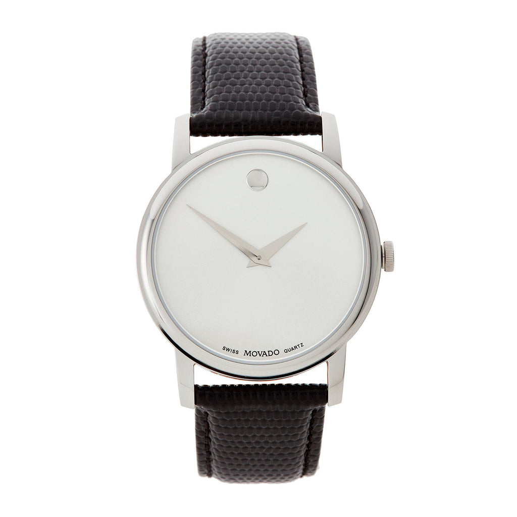 Stainless steel case with a black leather strap. Fixed stainless steel bezel. Silver dial with silver-tone hands. No markers. The Movado dot marks the 12 o'clock position. Dial Type: Analog. Quartz movement. Scratch resistant sapphire crystal. Pull / push crown. Solid case back. Case diameter: 26 mm. Case thickness: 7 mm. Round case shape. Strap width: 14 mm. Tang clasp. Water resistant at 30 meters / 100 feet. Functions: hour, minute. Dress watch style. Watch label: Swiss Made. Movado Museum Silver Dial Stainless Steel Ladies Watch