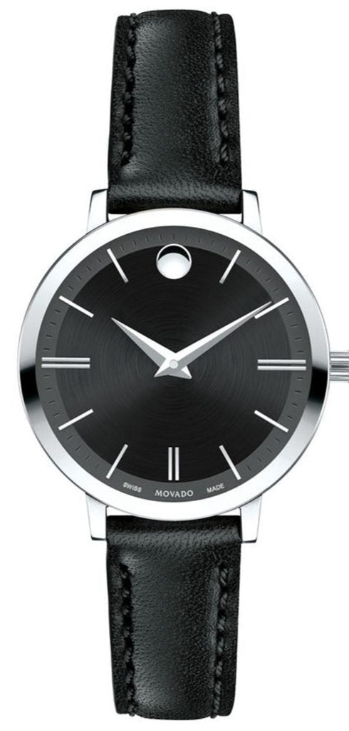 Movado Ultra Slim Black Dial Black Leather Strap Watch For Women - 0607094