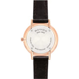 Movado Watch Ultra Slim 607096. Womens Movado Ultra Slim watch, 28 mm rose gold PVD finished stainless steel case, 5.75 mm thin; silvered white CD cut dial with fine concentric circles texture, rose gold toned signature dot and thin applied stick markers; chocolate brown calfskin strap with matching top stitching and rose gold PVD finished stainless steel classic tongue buckle.
