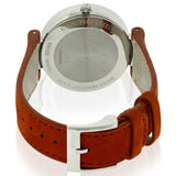 Stainless steel case with a dark orange leather strap. Fixed stainless steel interlocking G bezel. Orange dial with silver-tone hands. No markers. Dial Type: Analog. Quartz movement. Scratch resistant sapphire crystal. Pull / push crown. Solid case back. Case size: 37 mm. Case thickness: 8 mm.