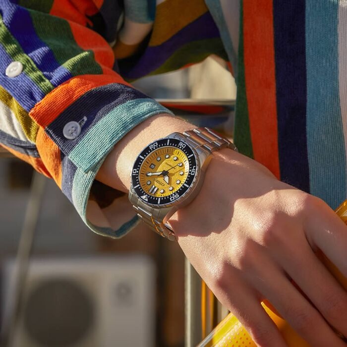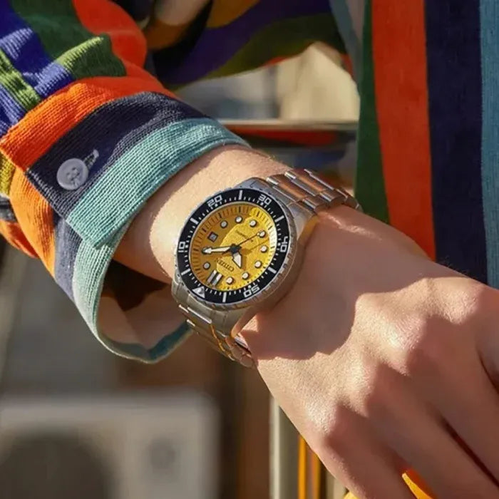 Citizen NJ0170-83Z Metal Band Men Watch. The case is made out of silver stainless steel with a black bezel, which stands for the high quality of the item, it has a yellow color dial. This model has got 100 meters of water resistance. it can be worn in scenarios where it is likely to be splashed but not immersed in water and will be fine in rain. The watch is shipped with an original box