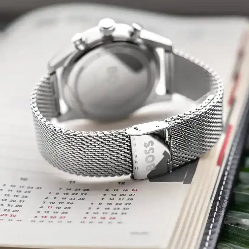 Master the art of sophisticated timekeeping with the Hugo Boss Skytraveller Chronograph. This striking timepiece features a captivating blue dial that commands attention, paired with a refined silver mesh strap for effortless versatility. The chronograph functionality delivers precision for those who demand performance alongside style. Built with Hugo Boss's signature craftsmanship, this watch seamlessly transitions from boardroom meetings to weekend adventures. A statement piece that speaks to your discerning taste and appreciation for quality engineering.