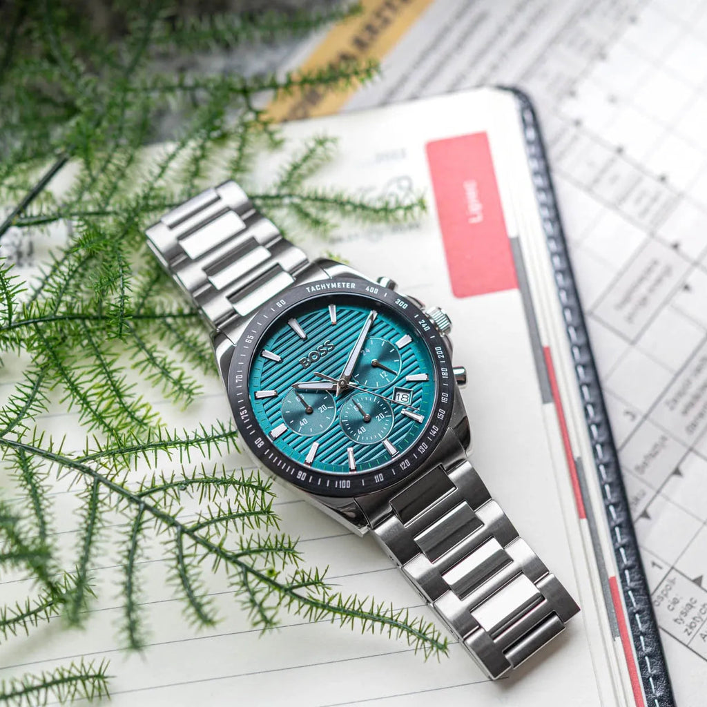 From a passion for quality and style, comes the Hugo Boss Stainless Steel Green Dial chronograph Men's Watch - 1514241. Featuring a Quartz fashion chronograph movement and a sleek 41mm stainless steel case, this watch is both functional and fashionable. The striking green dial and 22mm stainless steel strap add a touch of luxury, while the 5 Atm water resistance and push-button deployment clasp ensure durability and ease of use. Elevate your style with this must-have timepiece from Hugo Boss.