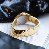 Amaze everyone around you by wearing this women's analog watch from Guess. The gold round dial is protected by a mineral glass. It features plain 3-hand and a crown for time adjustment. The stainless steel strap comes in a gold hue that further elevates the look of the timekeeper. Besides, it is completed with a fold-over clasp with double push button safety clasp to ensure a secure fit on the wrist.