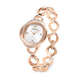 This Swarovski watch displays a brilliant integration of natural forms and modern design. Inspired by flowers, the bezel features two intertwined lines of shimmering rose-gold tone PVD coating, one adorned with glittering crystals.