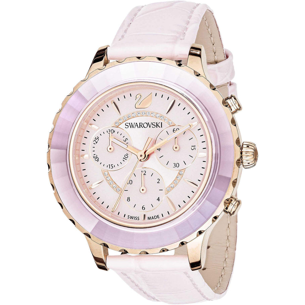 Joining our bestselling Octea line, this sporty new chronograph watch is a shimmering showcase of watchmaking precision and Swarovski craftsmanship. Perfect for everyday wear, it features a stopwatch function with accumulated and interval timing. Its rose gold-tone coated stainless steel case is finished with the faceted crystal bezel exclusive to Swarovski watches, which gleams in light pink tones to match the pink sunray dial and crocodile-embossed genuine leather strap. Case: 39 mm, water resistant to 50 m, Swiss Made.