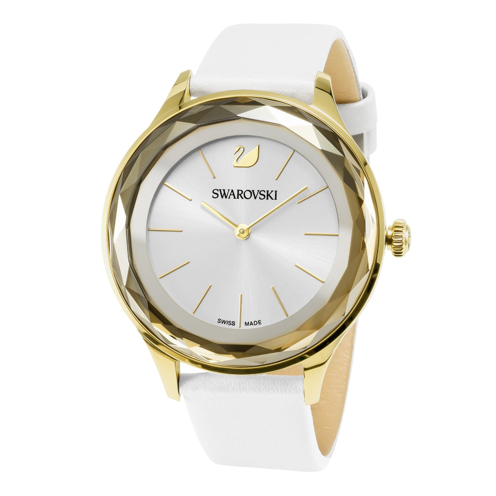 Gold-tone stainless steel case with a white leather strap. Fixed (faceted) gold-tone bezel. Silver dial with gold-tone hands and index hour markers. The Swarovski Swan logo appears at the 12 o'clock position. Dial Type: Analog. Quartz movement. Scratch resistant sapphire crystal. Pull / push crown. Solid case back. Round case shape. Case size: 36 mm. Band width: 14 mm. Tang clasp. Water resistant at 50 meters / 165 feet. Functions: hour, minute. Octea Nova Series. Casual watch style. Watch label: Swiss Made. Swarovski Octea Nova Quartz Silver Dial Ladies Watch 5295337.